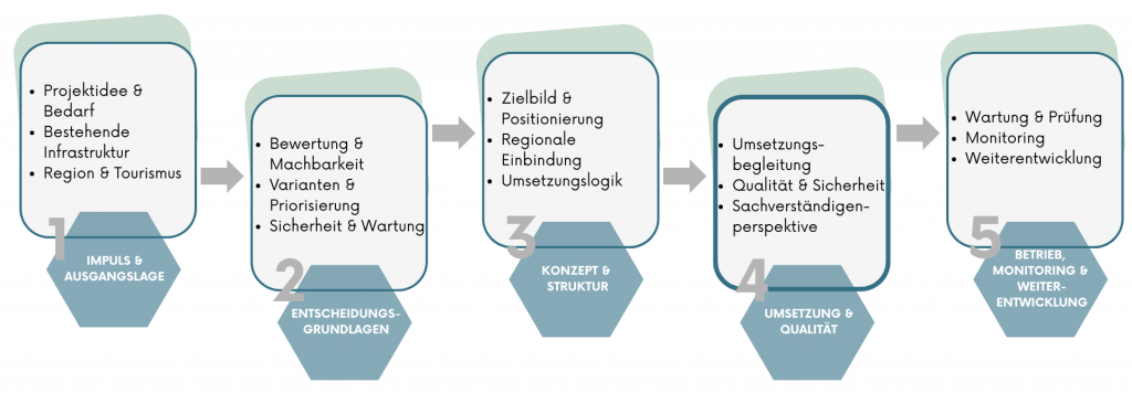 Unsere Arbeit verbindet unterschiedliche Perspektiven: die Anforderungen von Betreibern, touristische Zielsetzungen von Regionen und Verbänden sowie die Nutzung durch Gäste und Einheimische. Sicherheit, Normen, Betrieb, Wartung und Lebensdauer sind dabei keine nachgelagerten Themen, sondern von Beginn an Teil der Projektlogik.
