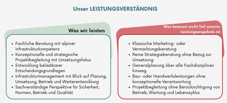 Wir begleiten alpine, kommunale und regionale Projekte von der ersten Idee bis zur umgesetzten Infrastruktur. Unser Schwerpunkt liegt dort, wo die entscheidenden Weichen gestellt werden: bei der fachlichen Bewertung, der konzeptionellen Ausarbeitung und der umsetzungsorientierten Begleitung. Je nach Projekt führen wir entwickelte Konzepte auch baulich aus oder begleiten deren Realisierung fachlich bis zur Fertigstellung.