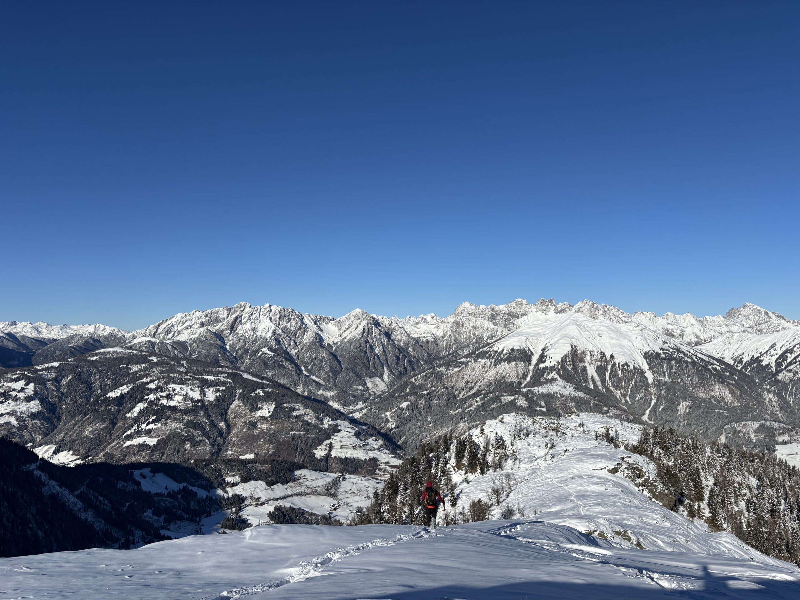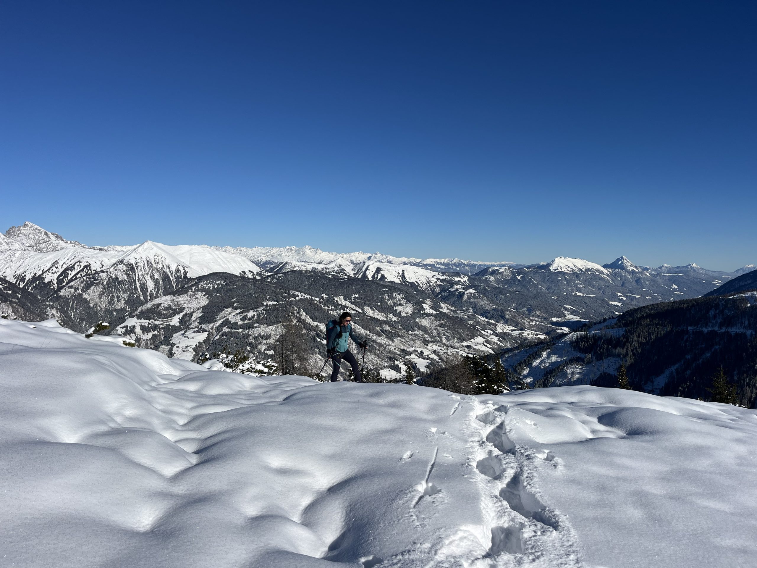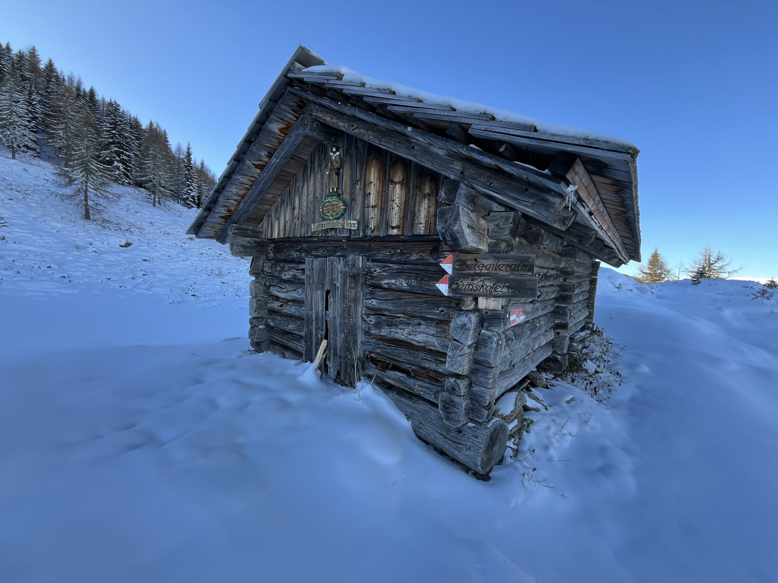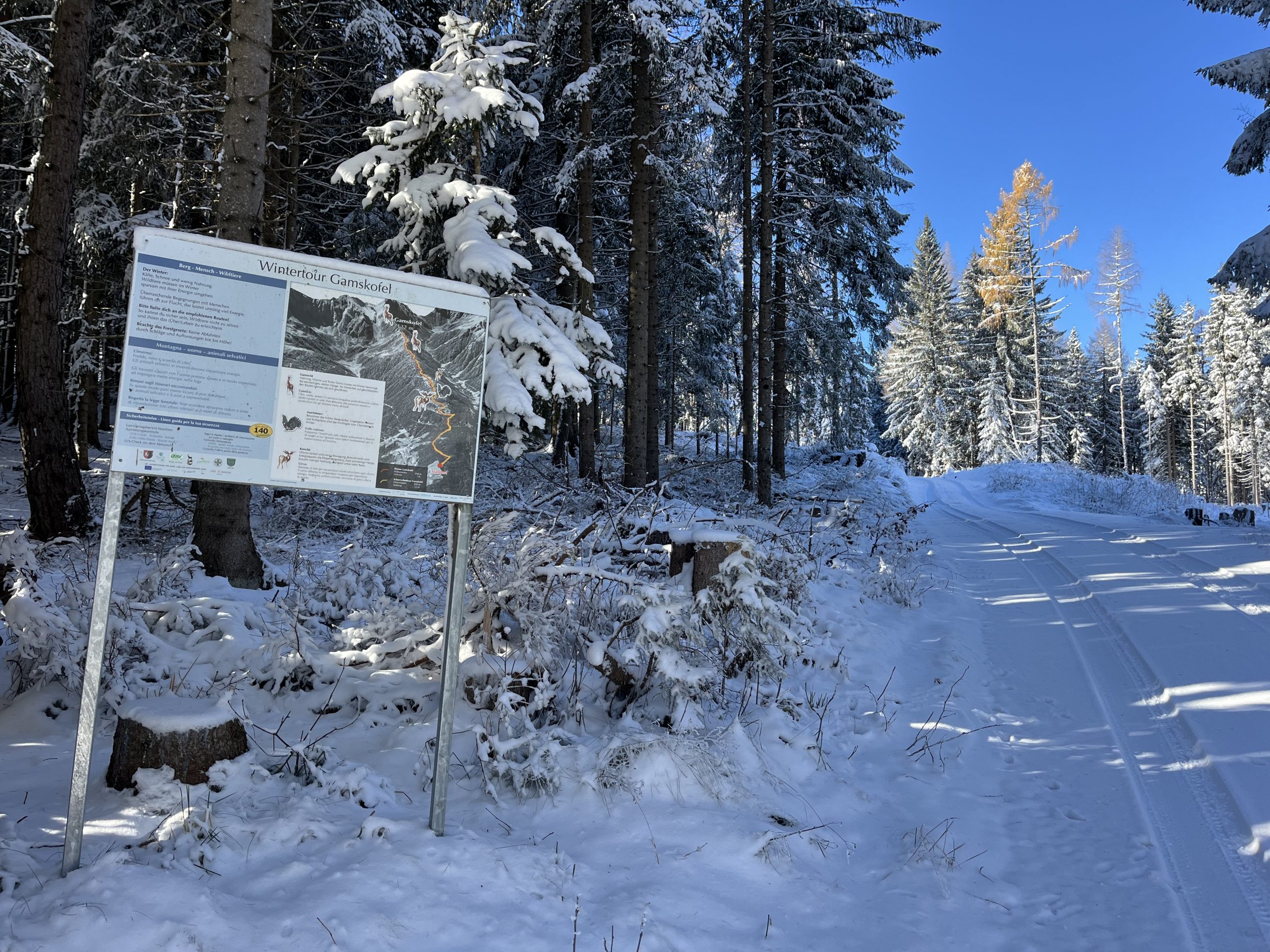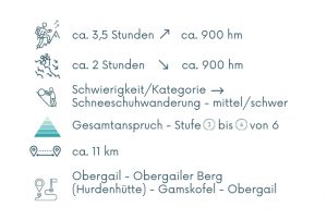 Für den Abstieg benötigst du ca. 2 Stunden – somit ergibt sich eine Gesamtzeit (reine Gehzeit, ohne Pausen) von ca. 5,5 Stunden für die Schneeschuhwanderung auf den Gamskofel.