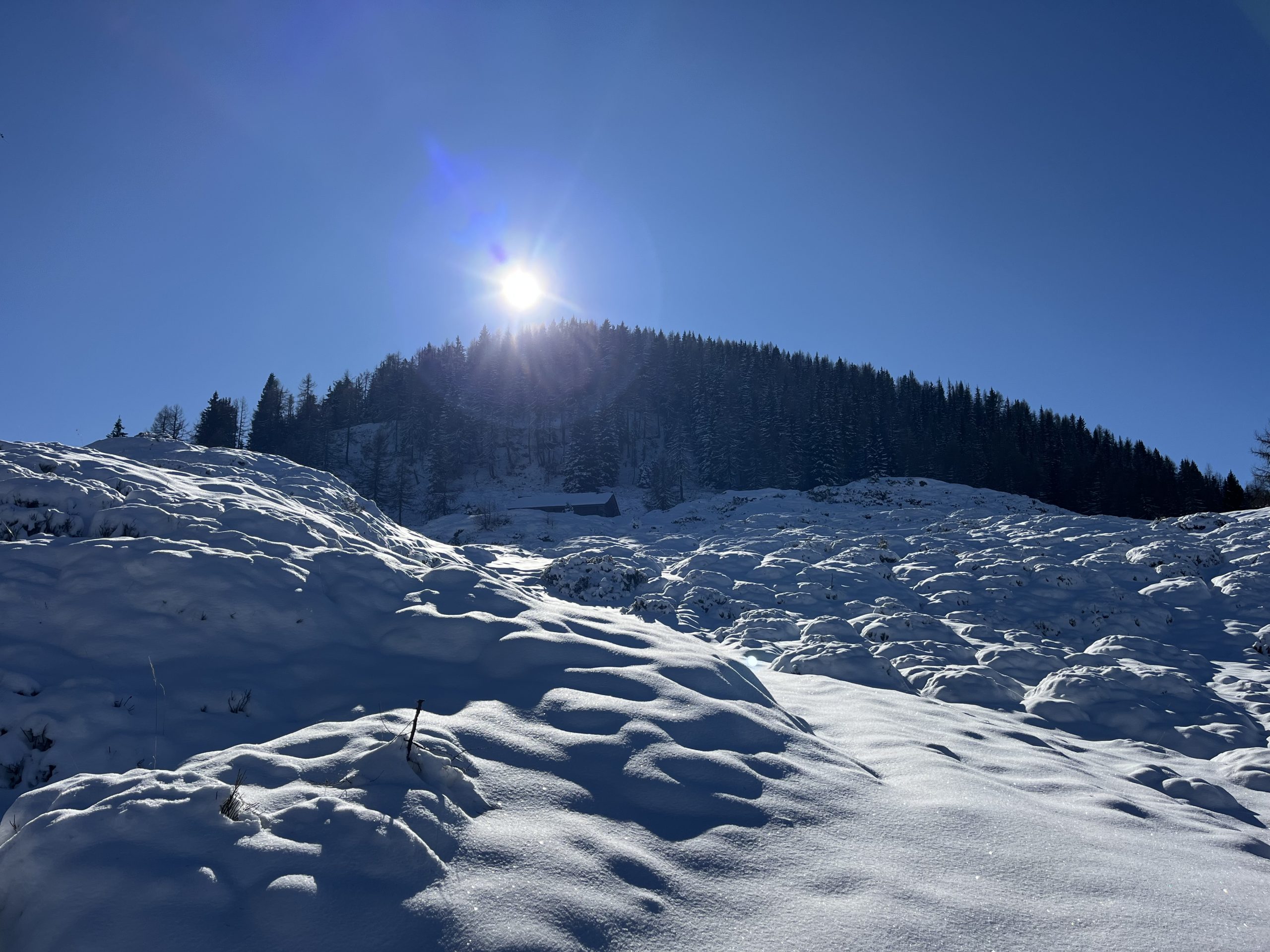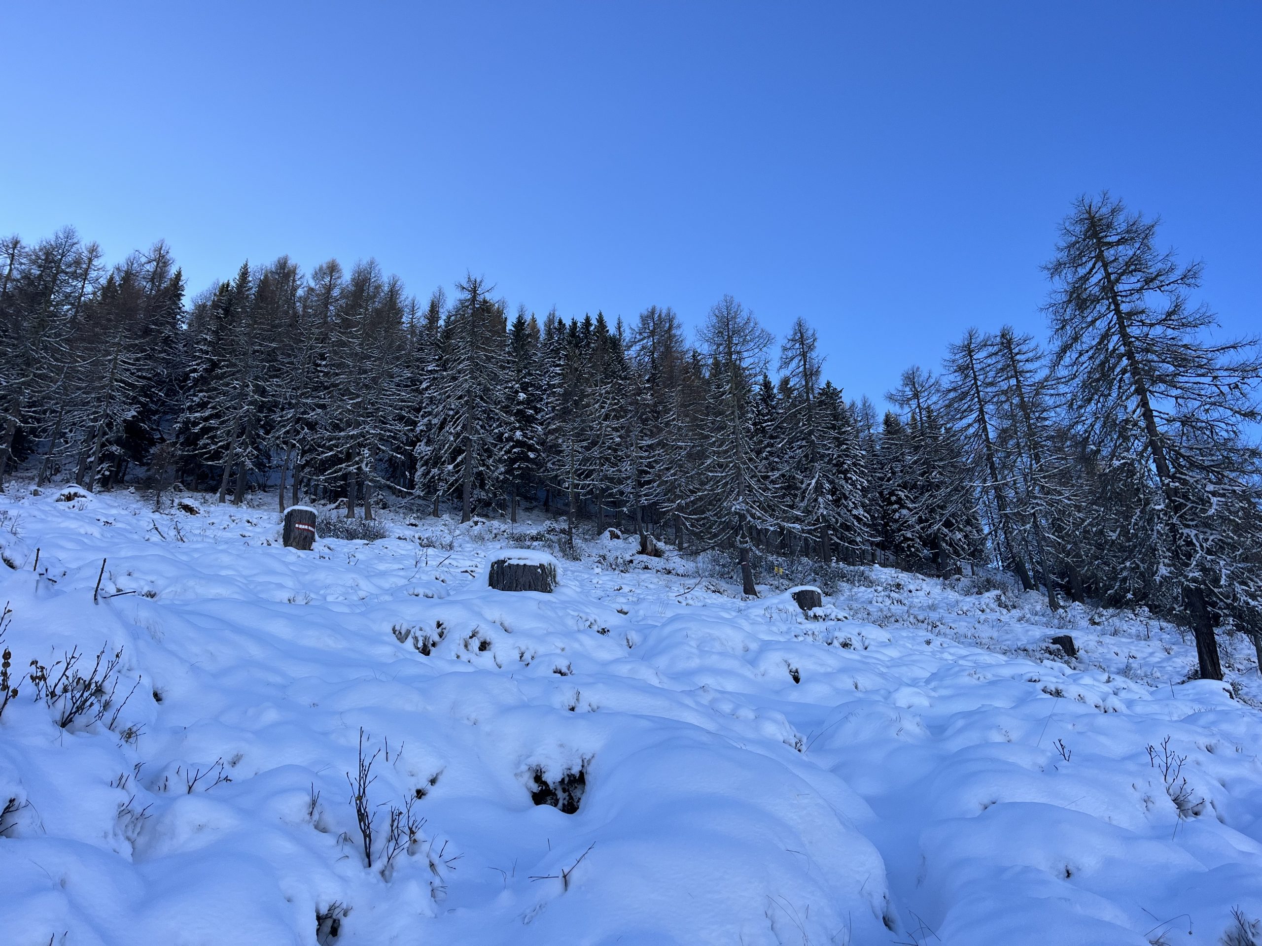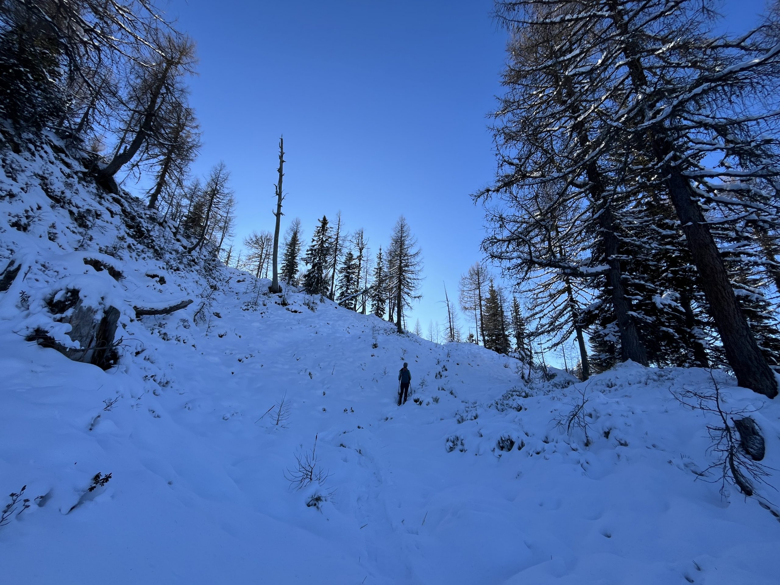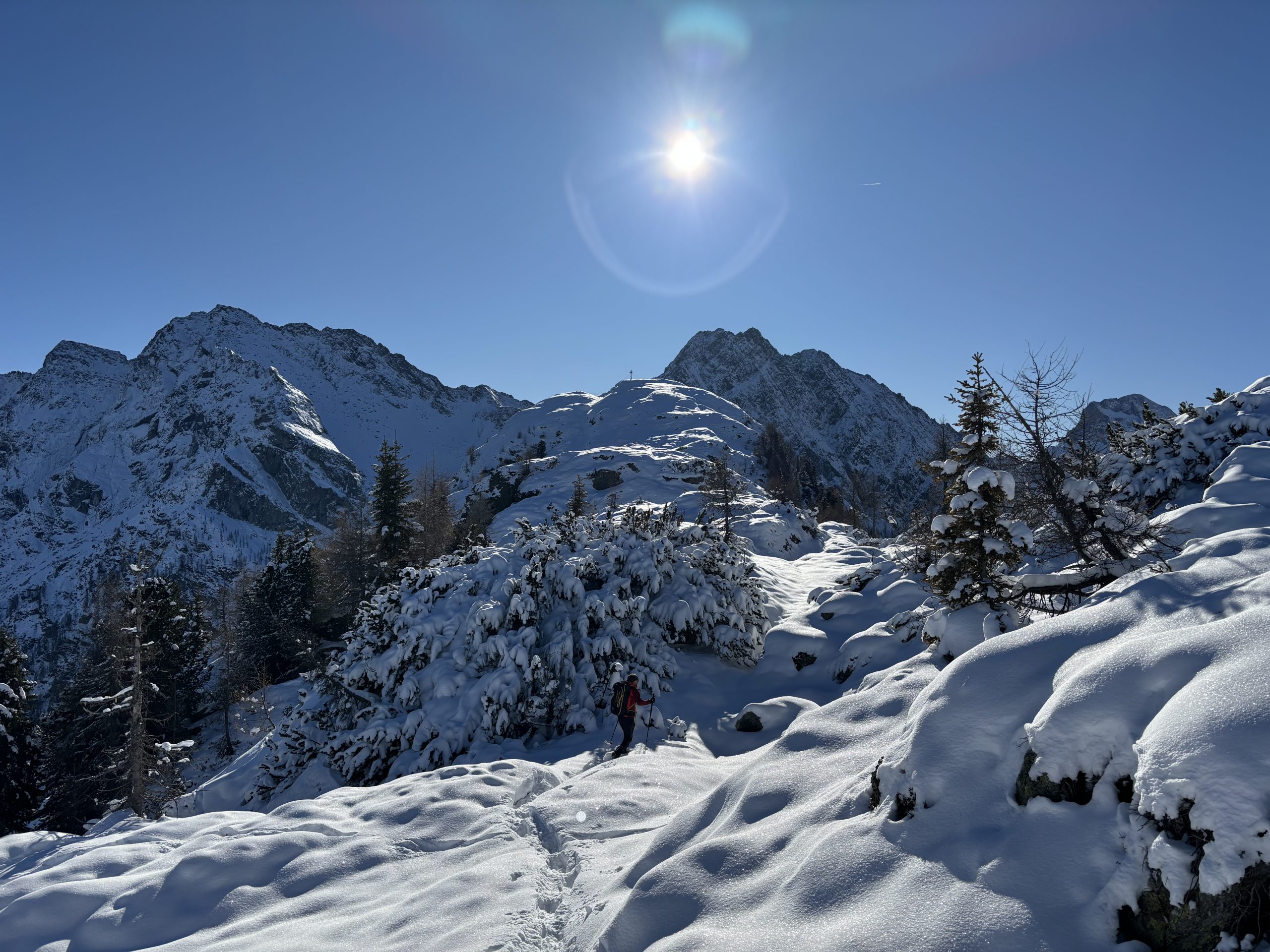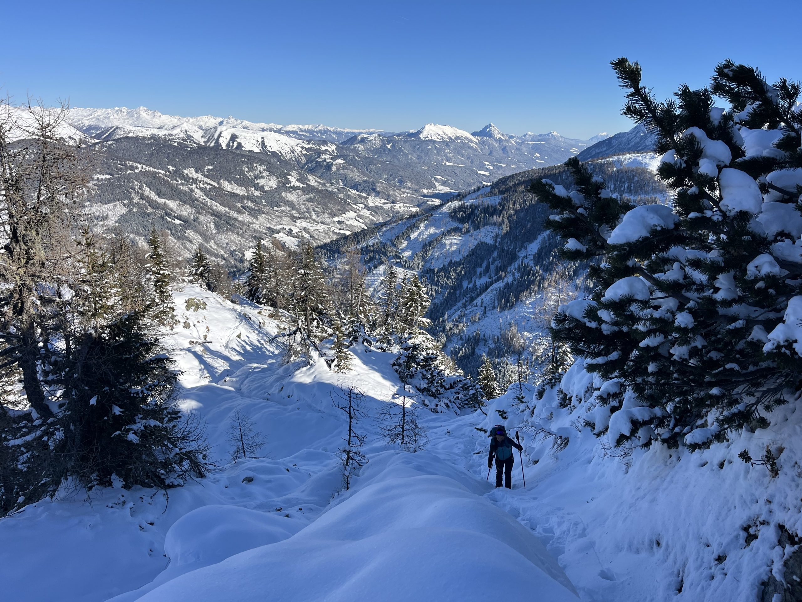 Für den Abstieg benötigst du ca. 2 Stunden – somit ergibt sich eine Gesamtzeit (reine Gehzeit, ohne Pausen) von ca. 5,5 Stunden für die Schneeschuhwanderung auf den Gamskofel.