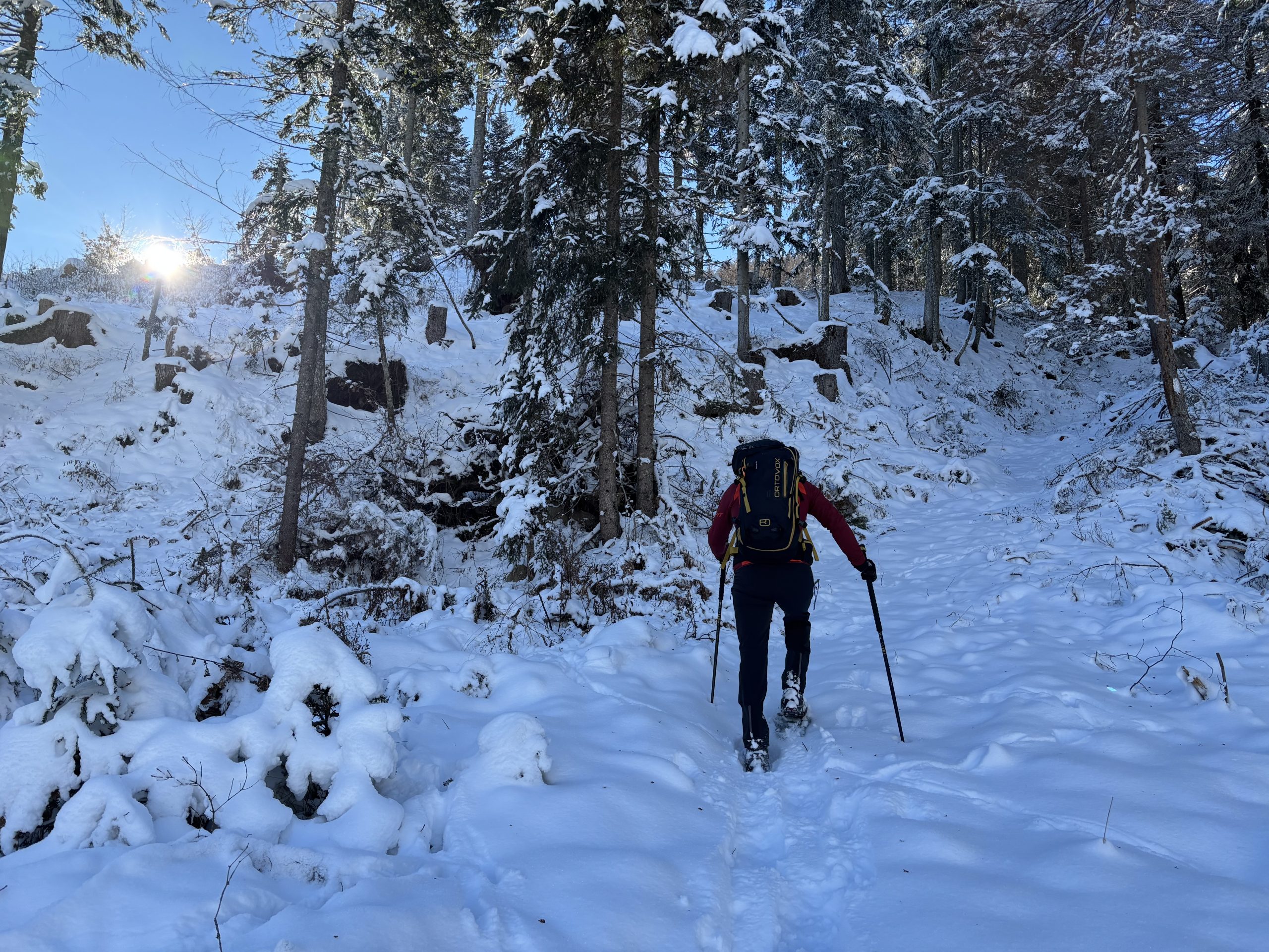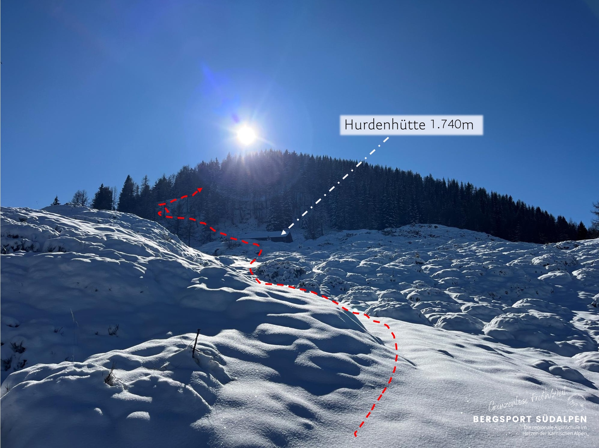 Ab der Hurdenhütte ändert sich der Charakter der Tour – der Aufstieg wird um einiges fordernder. Einerseits wird die Orientierung (vor allem bei mehr Schnee) komplexer (es gibt wesentlich weniger Wegweiser und auch weniger Markierungen an den Bäumen, sondern mehr Markierungen an Steinen, die jedoch bei Schnee oftmals kaum bis gar nicht ersichtlich sind) und anderseits wird das Gelände steiler und wesentlich kupierter als im Abschnitt bis zum Obergailer Berg.