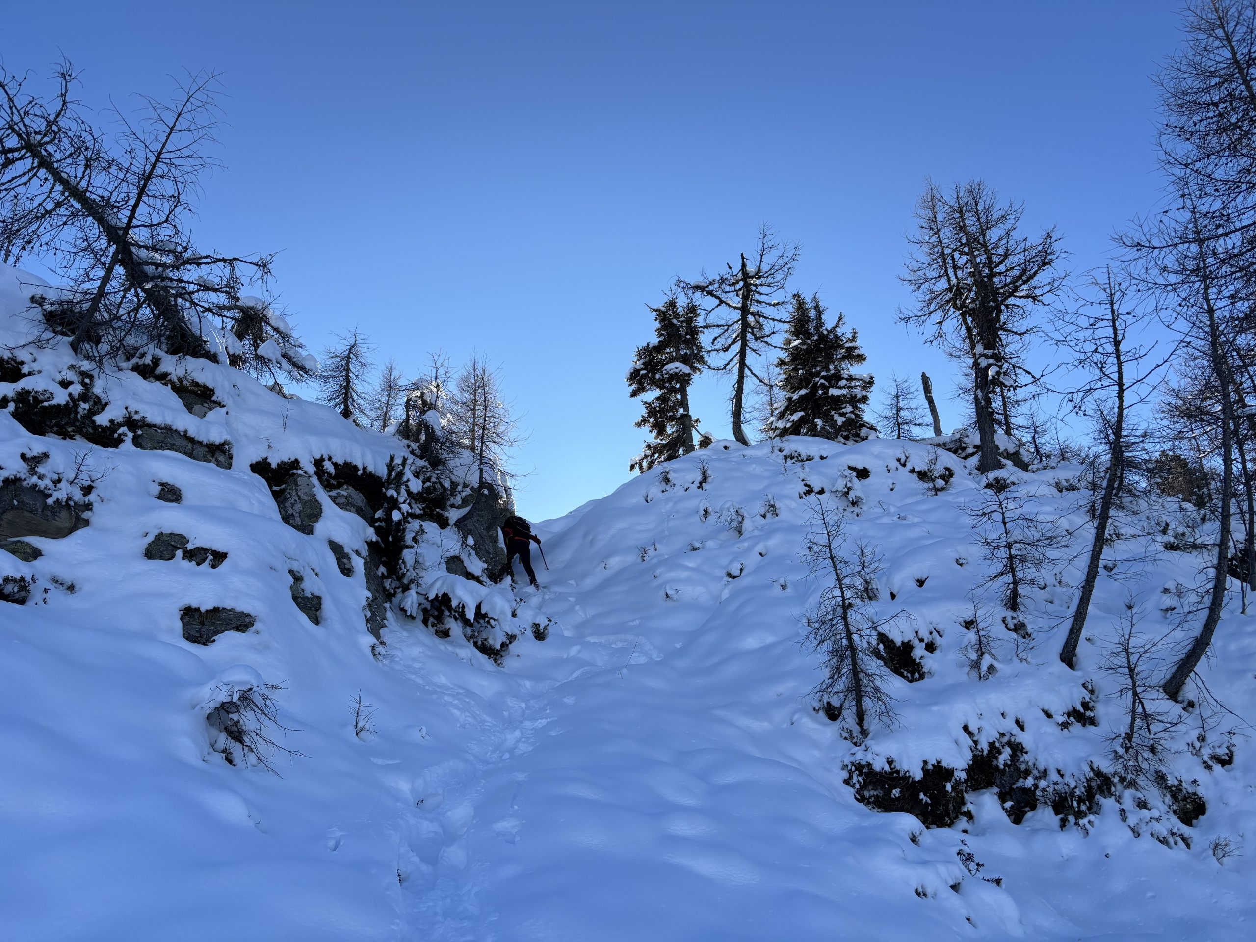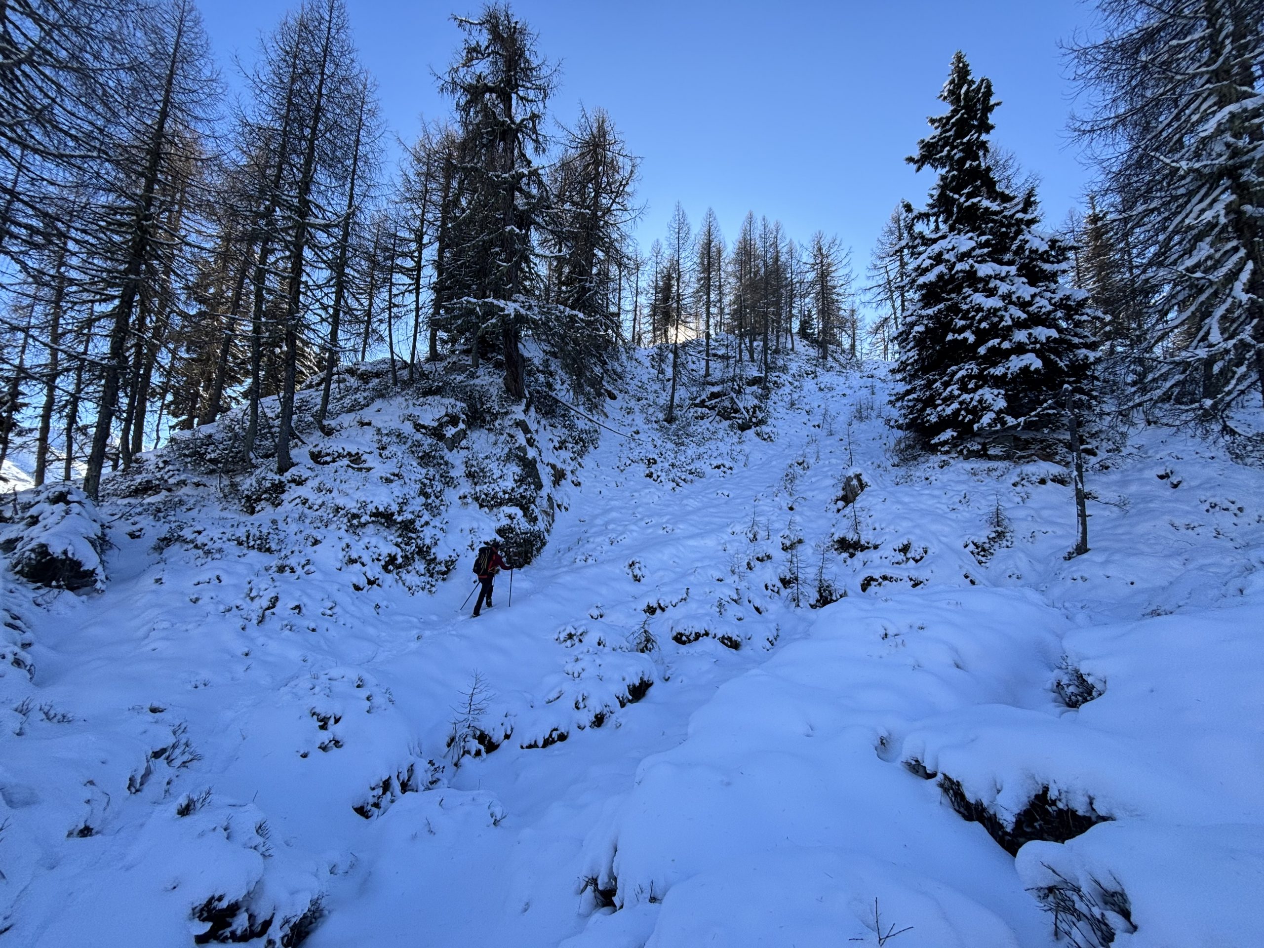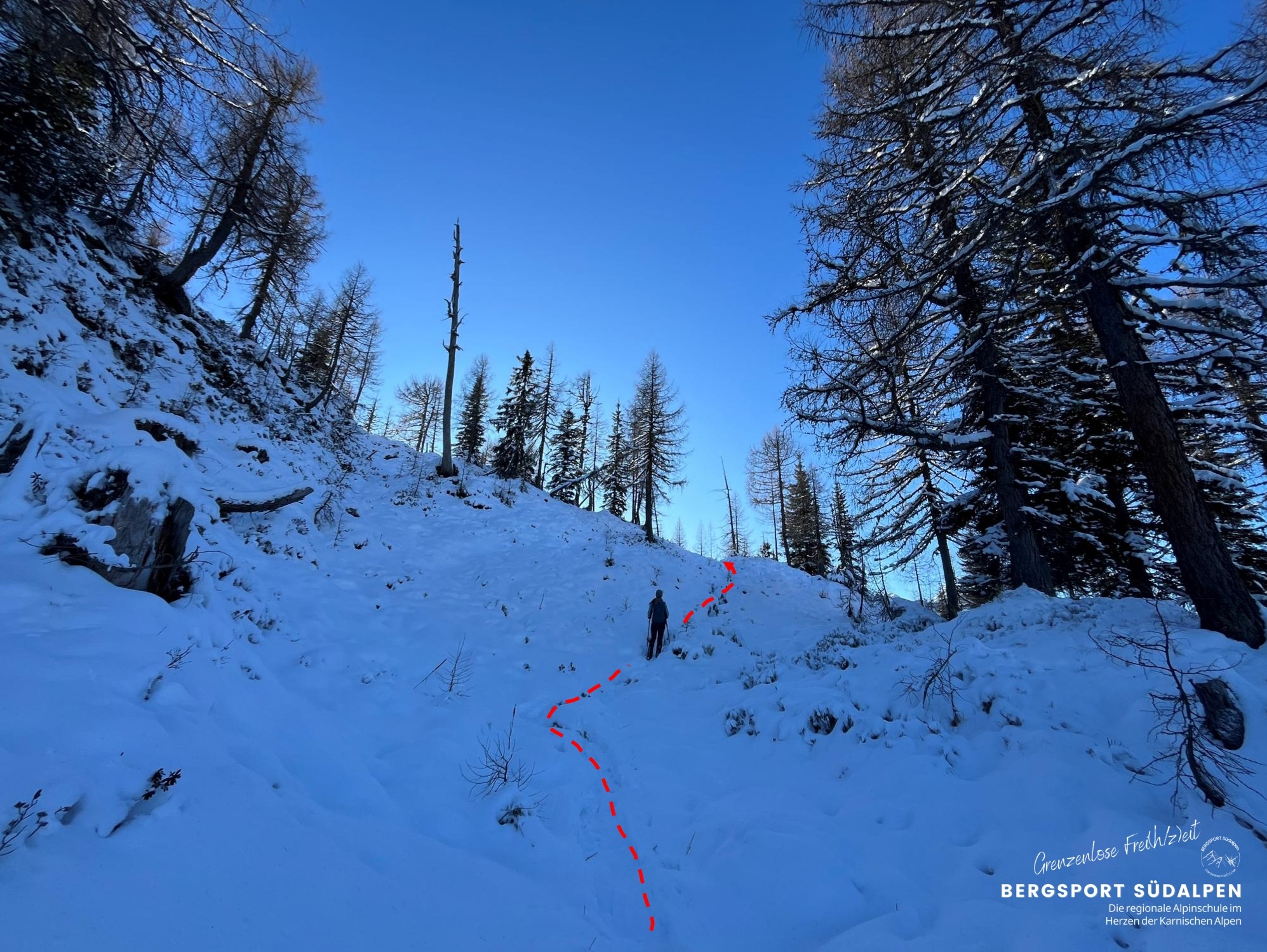 Nach der Hurdenhütte verläuft der Steig ca. 30 Minuten, über zahlreiche Kehren, einen steilen Waldsteig aufwärts. Anschließend flacht die Route bei ca. 1.880m für einige Minuten wieder etwas ab. Danach wird die Orientierung kurzzeitig etwas schwieriger – du wanderst zuerst – unterhalb eines Jagdstands, rechts haltend, aufwärts – um danach, ca. 5m unterhalb eines hohen, kahlen Baumstamms ein Teilstück nach rechts zu queren (bei ca. 1.935m). Nun erwartet dich eine steilere Rinne (ca. 25hm) – rechts eines größeren Steins (inkl. Markierung), bevor die Route wieder abflacht und du kurz darauf auch den ersten Blick auf den Gipfel werfen kannst. Bevor du den Gipfelanstieg erreichst, folgt noch einmal ein kurzes Steilstück. Zum weitläufigen Gipfelplateau führt die ab hier mäßig steile Route zuerst durch Latschen sowie abschließend über den unbewaldeten, latschenfreien Rücken.