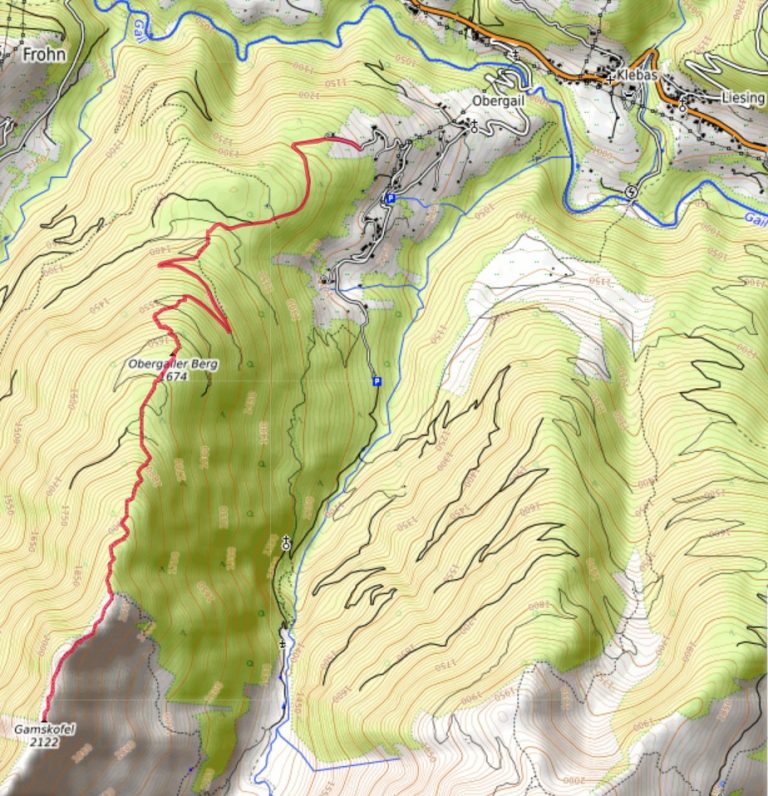 Zunächst wanderst du ca. 15 Minuten entlang der Forststraße aufwärts. Dein Weg führ dabei an einer Hinweistafel bezüglich Wildtierruhezonen, sowie einem Wasserreservoir vorbei (hier hältst du dich links – weiterhin entlang der Forststraße), bevor du bei ca. 1.360m einen Wegweiser erreichst. Hier zweigst du von der Forststraße nach links, dem Wegweiser in Richtung Obergailer Berg folgend, ab. Nun wanderst du ein paar Minuten über einen breiten Wanderweg, bevor du in weiterer Folge über einen Hohlweg (ebenfalls nach links abzweigend) weiter aufwärts gehst. Die Route verläuft nun über einen Steig, bevor dieser wieder in die Forststraße mündet – auf welcher du bis zu einer Heuhütte weiter wanderst. Kurz nach der Hütte, welche du nach ca. 1 Stunde Gehzeit erreichst, zweigt beim nächsten Wegweiser nach links der weitere Aufstiegsweg ab. Der Weg quert nun einige Male die Forststraße und führt dich durch das bewaldete Gelände Richtung Obergailer Berg (Hurdenhütte).